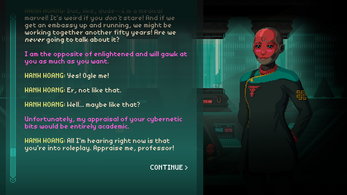 When talking to Hanh, I noticed that some dialogue choices were still available after I asked them once. You can eliminate them with variables, and probably should. Players hate having to re-read things just so they can find new choices.