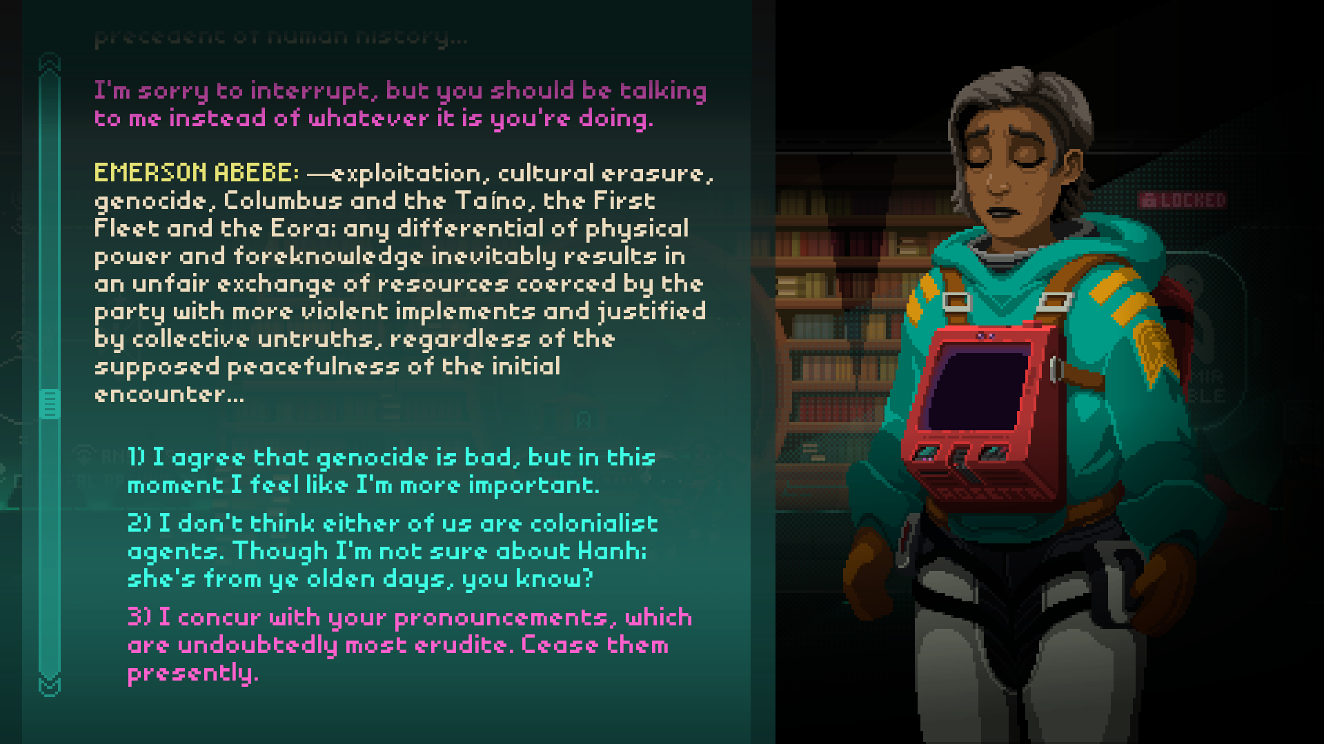 - I also appreciate how she talks about how not limiting oneself to make others comfortable- I also noticed that certain dialogue repeats itself here until the "human ingenuity is truly limitless" part- if there was a way to indicate what I've already selected (and what moves someone on from a conversation versus keeps them there) that'd be helpful because I am so the type to play to see everything :)